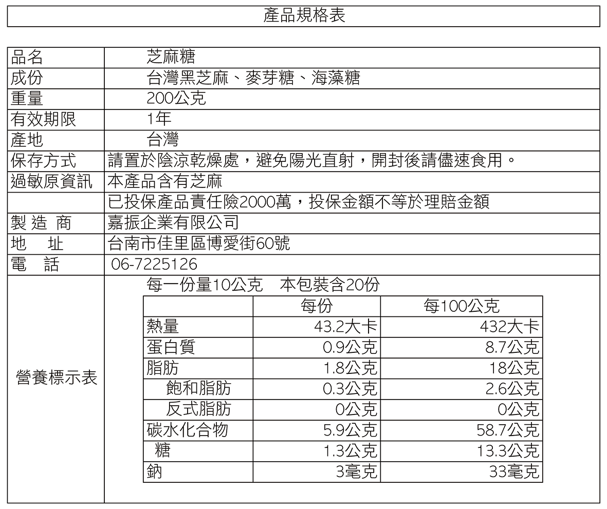 嚴選台灣本土黑芝麻,與麥芽糖、海藻糖結合,減糖香甜不黏牙,單片包裝方便不沾手。