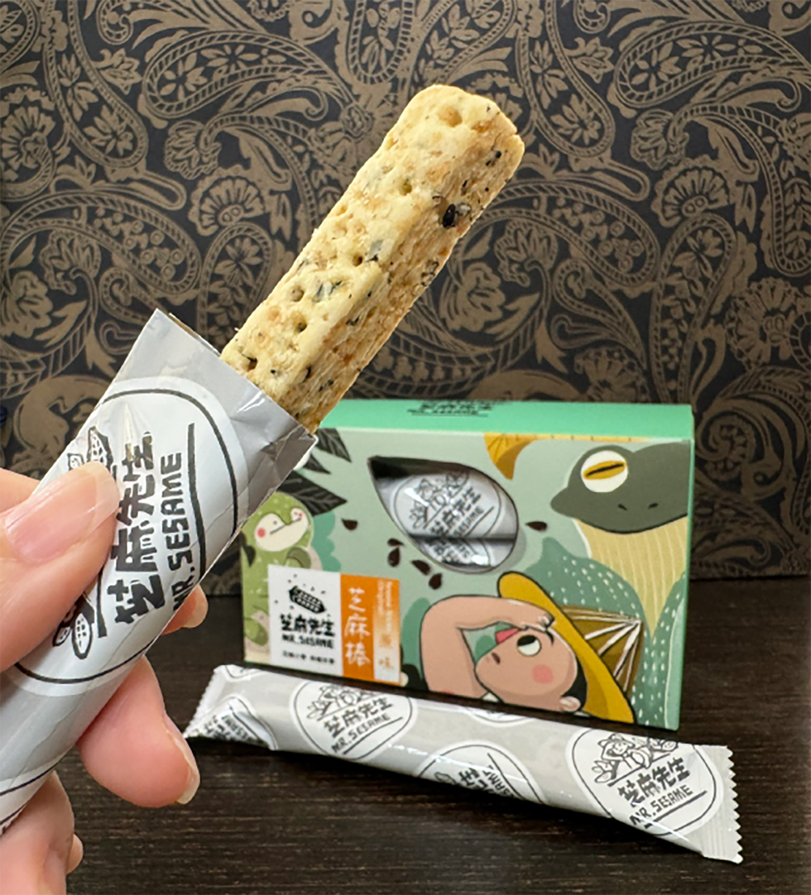 嚴選台灣本土黑芝麻,貼心製成酥脆可口小餅乾,長條小棒子形狀,單包裝方便不沾手。